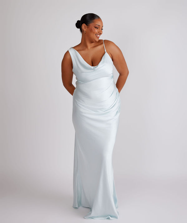 The most perfect confidence giving shape. The contemporary cowl front adds a romantic touch to a classic silhouette. The delicate neckline adds a touch of luxury, making it the perfect choice for a timeless yet modern wedding aesthetic.