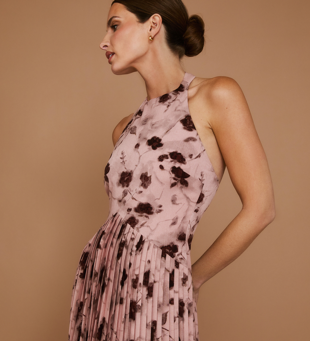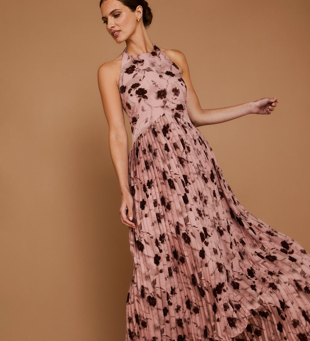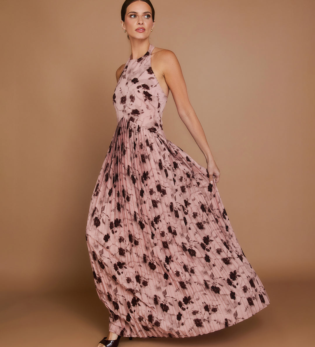 Meet Olivia - where feminine florals meet voluminous drama. With a full pleated skirt that moves like a dream, a trending dropped waist silhouette, and a clean halter neckline, this maxi dress is made for unforgettable entrances and photo-worthy twirls. Perfect for autumn weddings, winter parties, and every elegant RSVP in between.