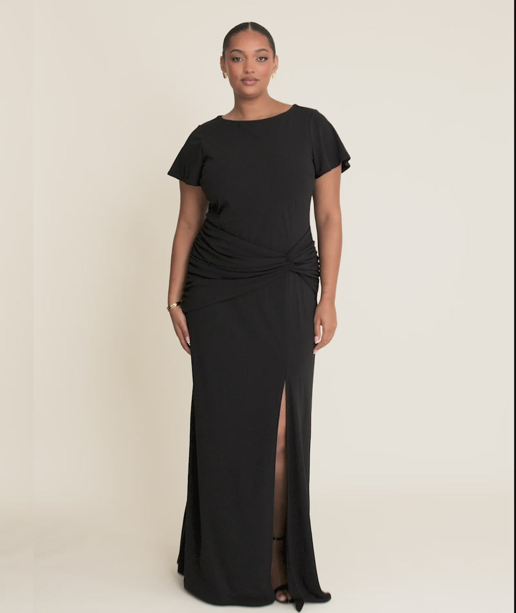 Meet FLEUR in Black, the bridesmaid gown that sculpts and supports without sacrificing comfort. The knot panel smooths the stomach, the flutter sleeve offers just the right coverage, and the front split adds a confident edge. Elegant, modern, and bra-friendly.