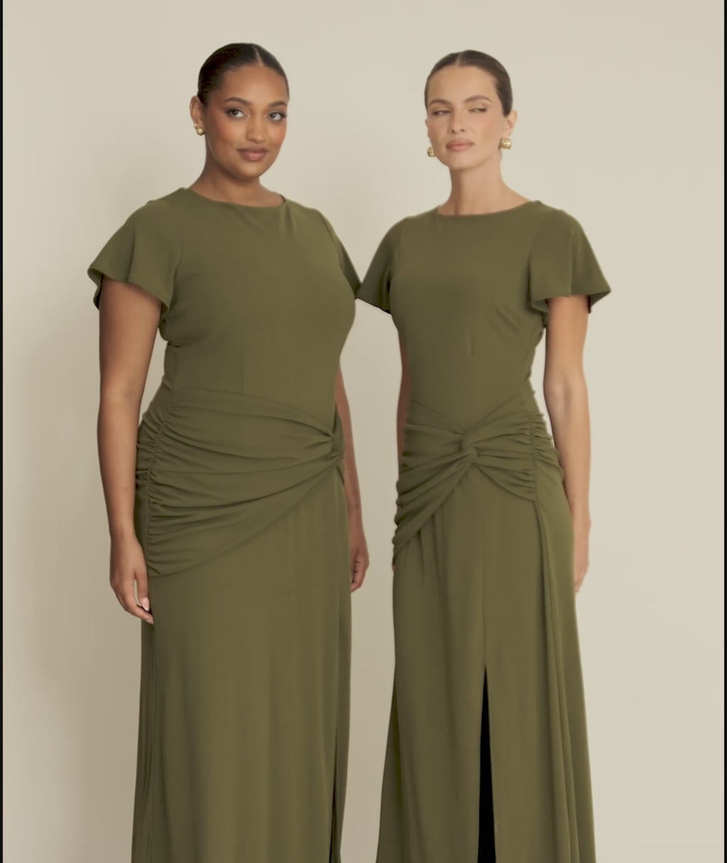 The FLEUR in Fern is rich, evergreen, and designed to flatter. Its sculpting knot panel and flutter sleeves create comfort and confidence, while the leg split brings effortless movement. A chic shade with a silhouette she’ll love to rewear. Elegant, modern, and bra-friendly.