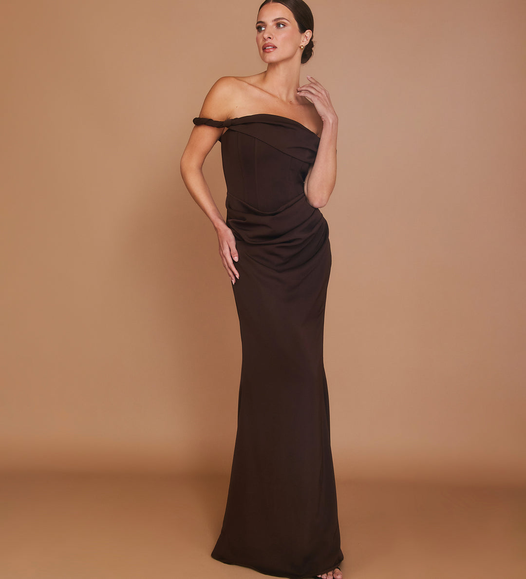 Thea - crafted in a premium matte woven fabric, this maxi dress brings effortless drama to Autumn soirées. The fully boned corset sculpts and supports, while the draped skirt panel with side gathering ensures comfort with every step. Finished with a Bardot twist strap and floor-sweeping length, it's designed to make an entrance.
